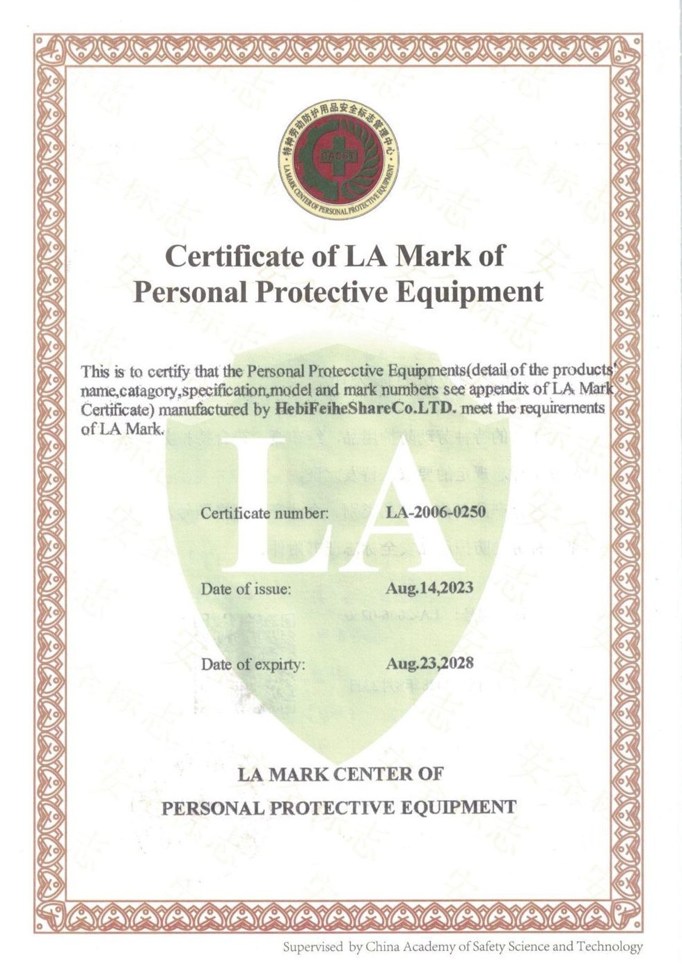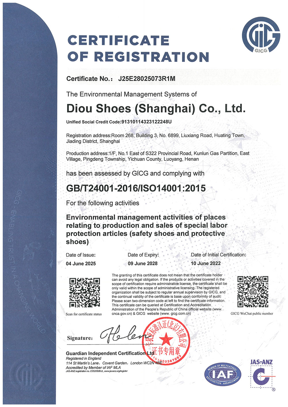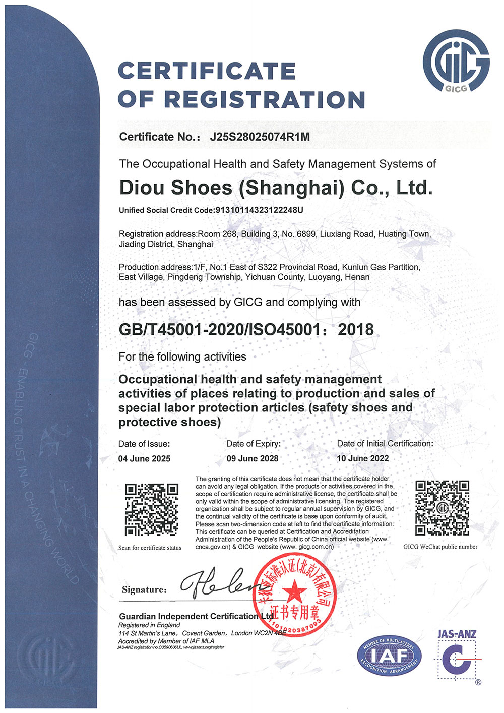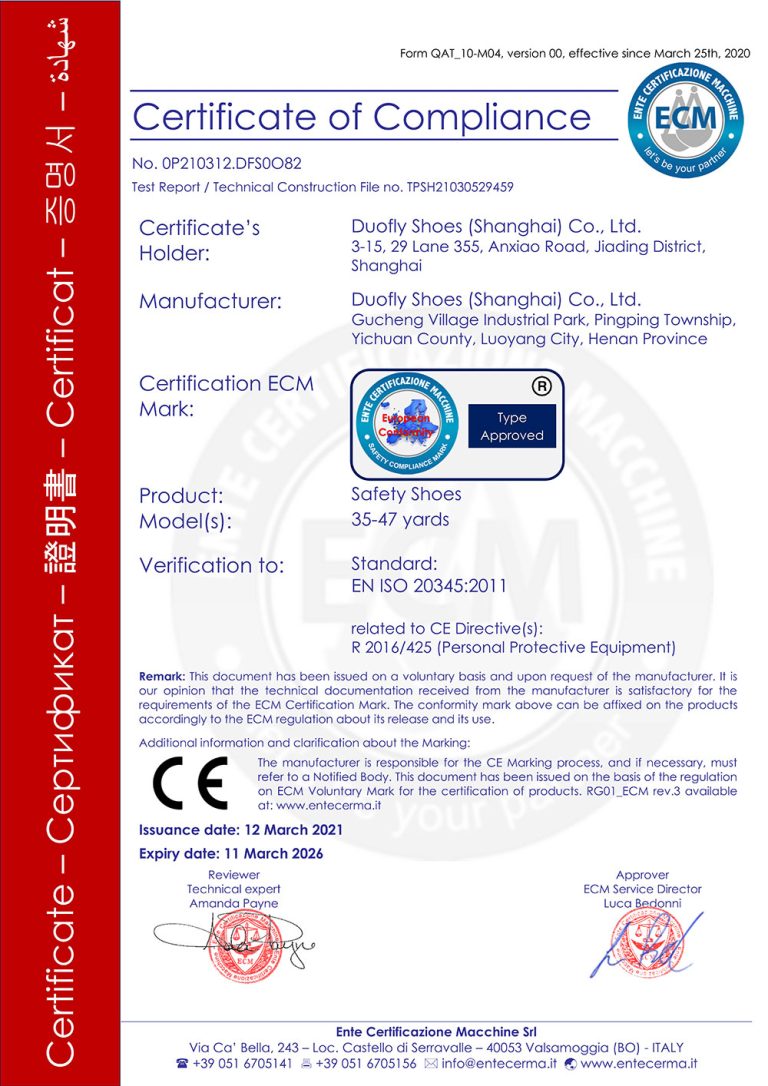 Certification confirming that our safety footwear complies with recognized personal protective equipment safety standards.