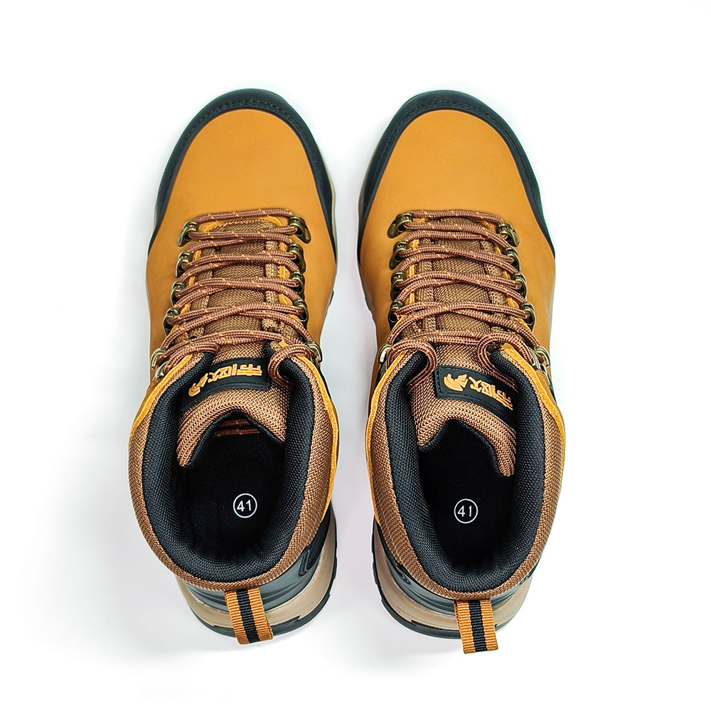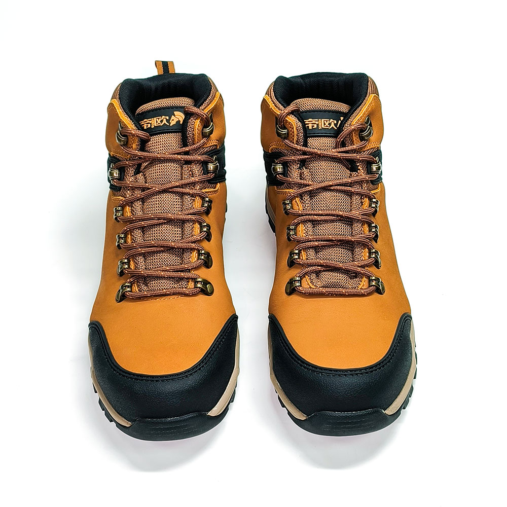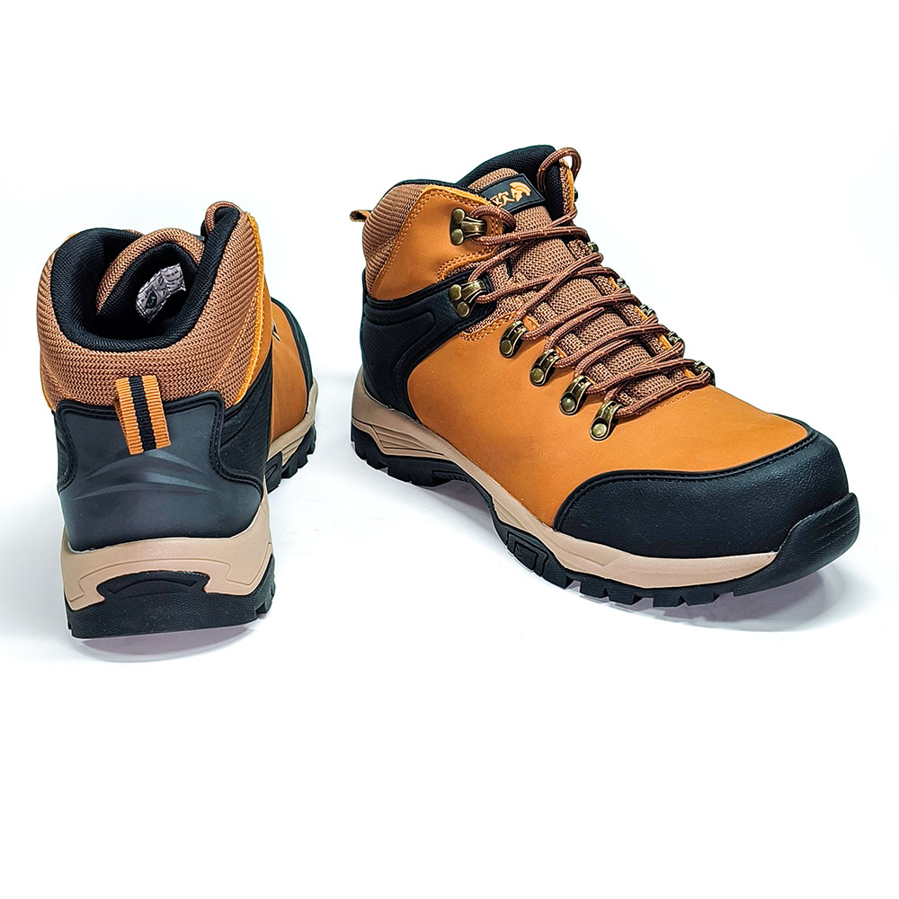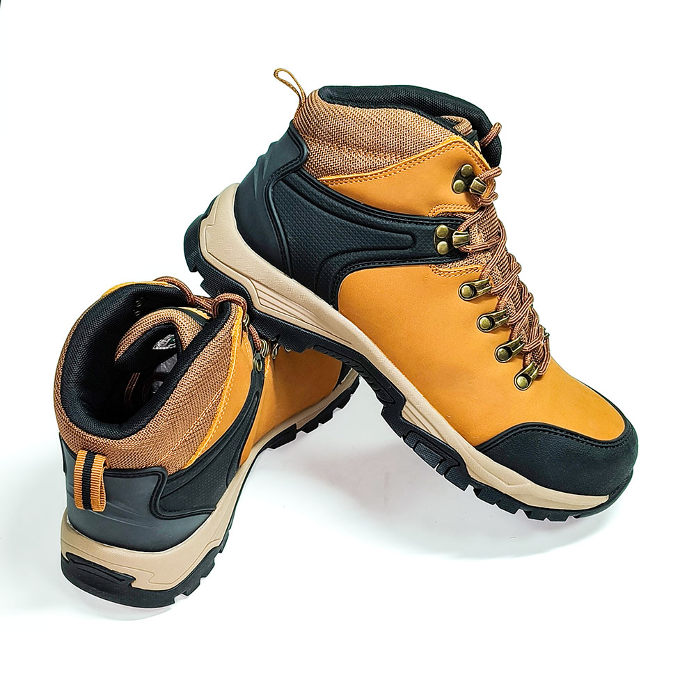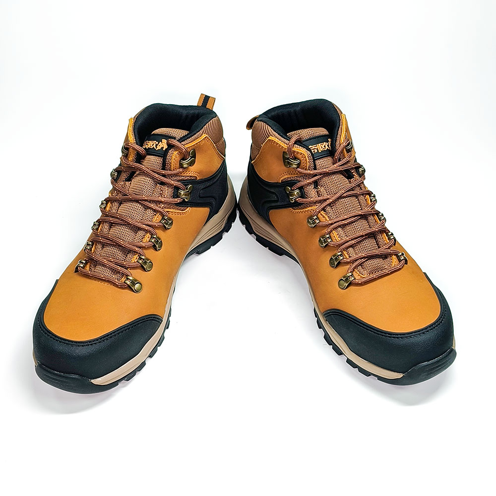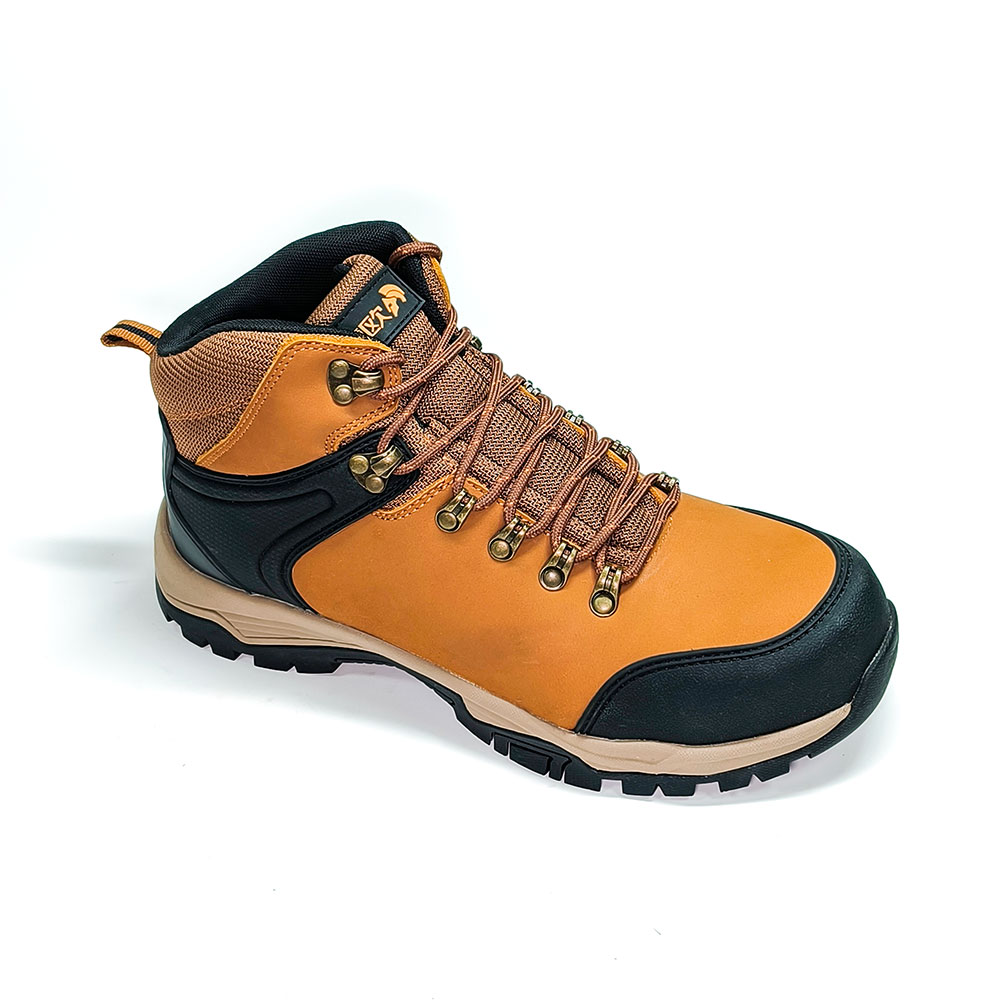 AC6021 features a brown leather upper with an orange-brown fabric collar for durability and comfort.