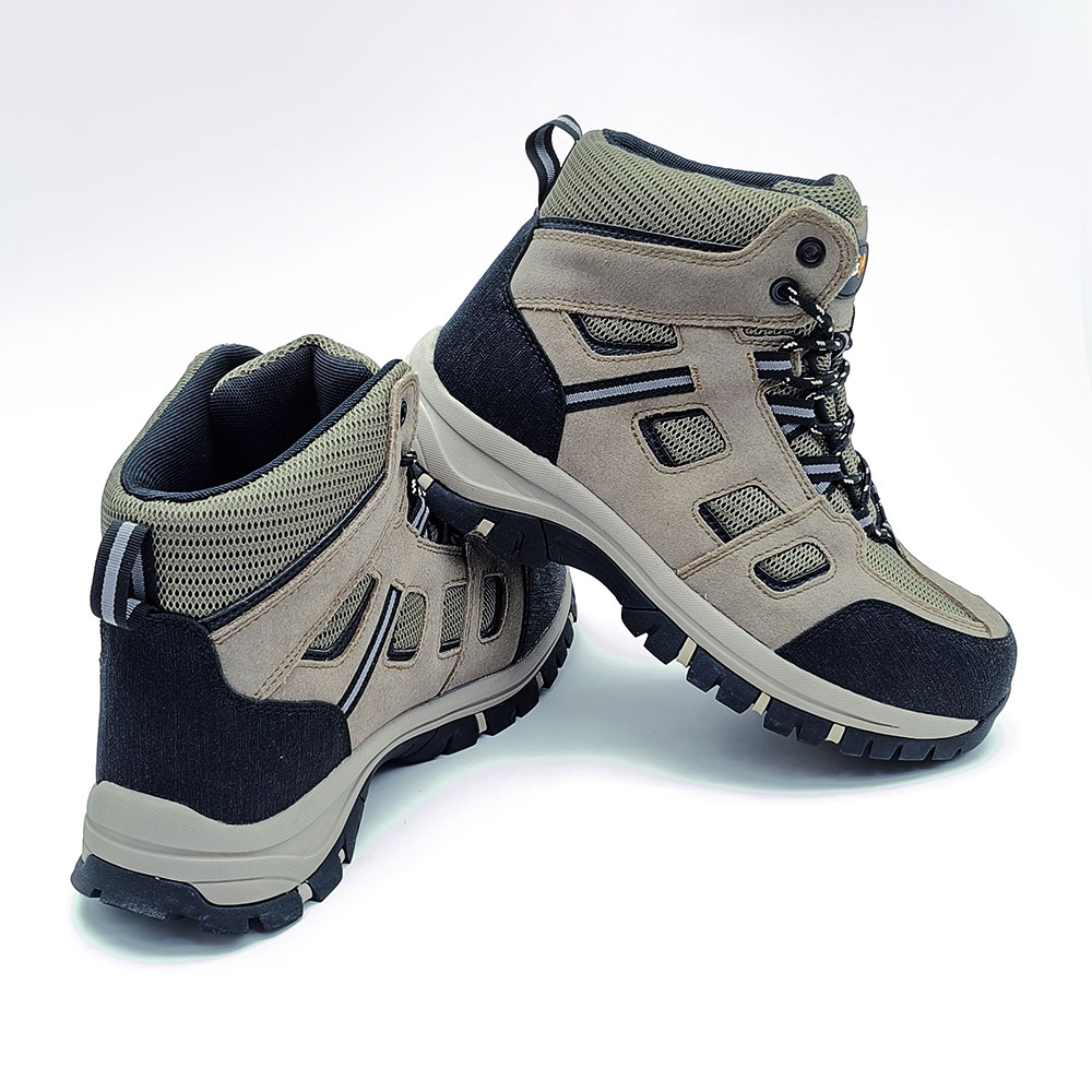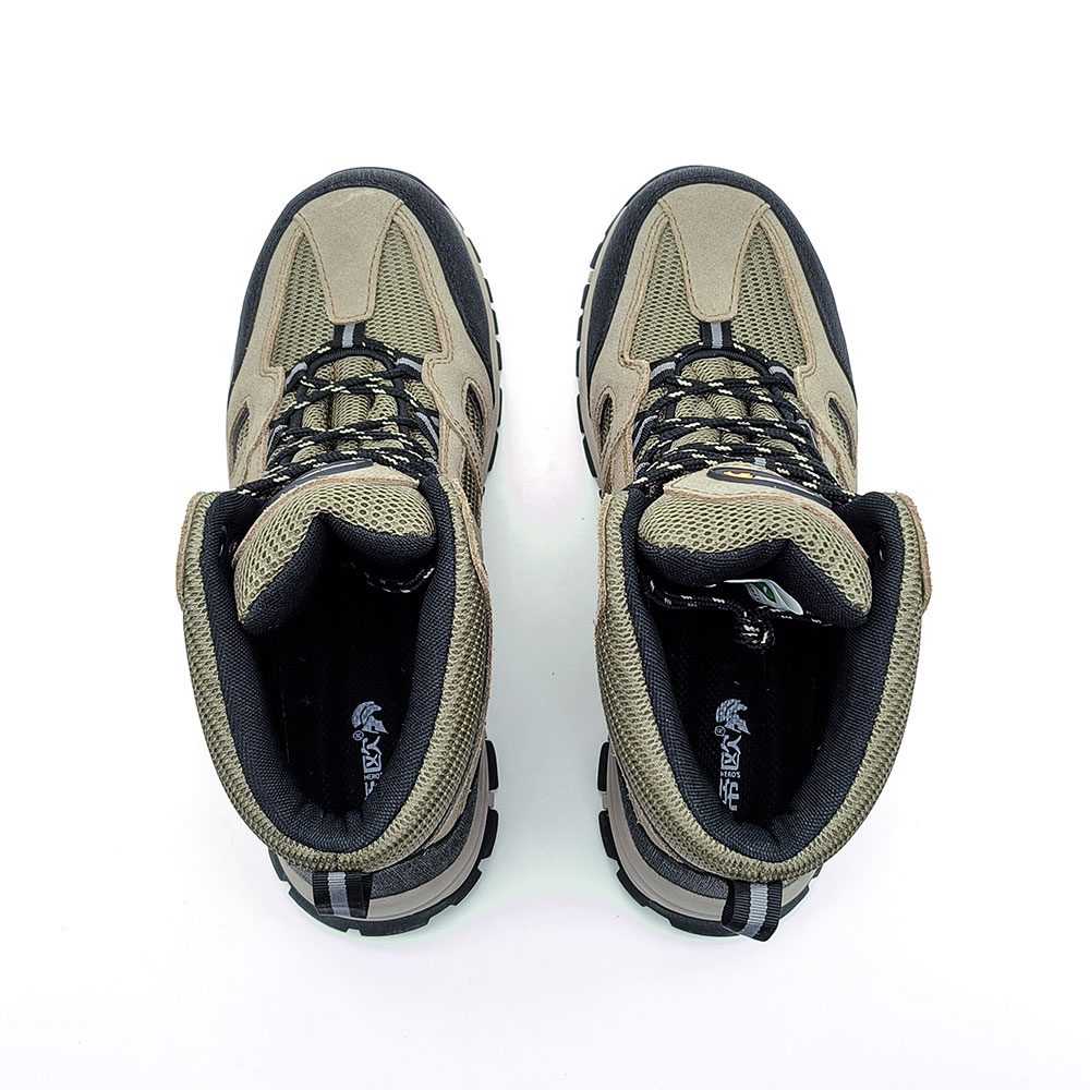 Its main features include a khaki and black color design, leather and mesh upper, mid-cut structure, and two-tone rubber outsole.