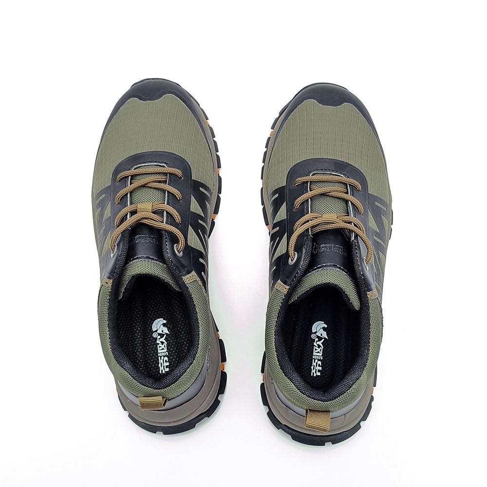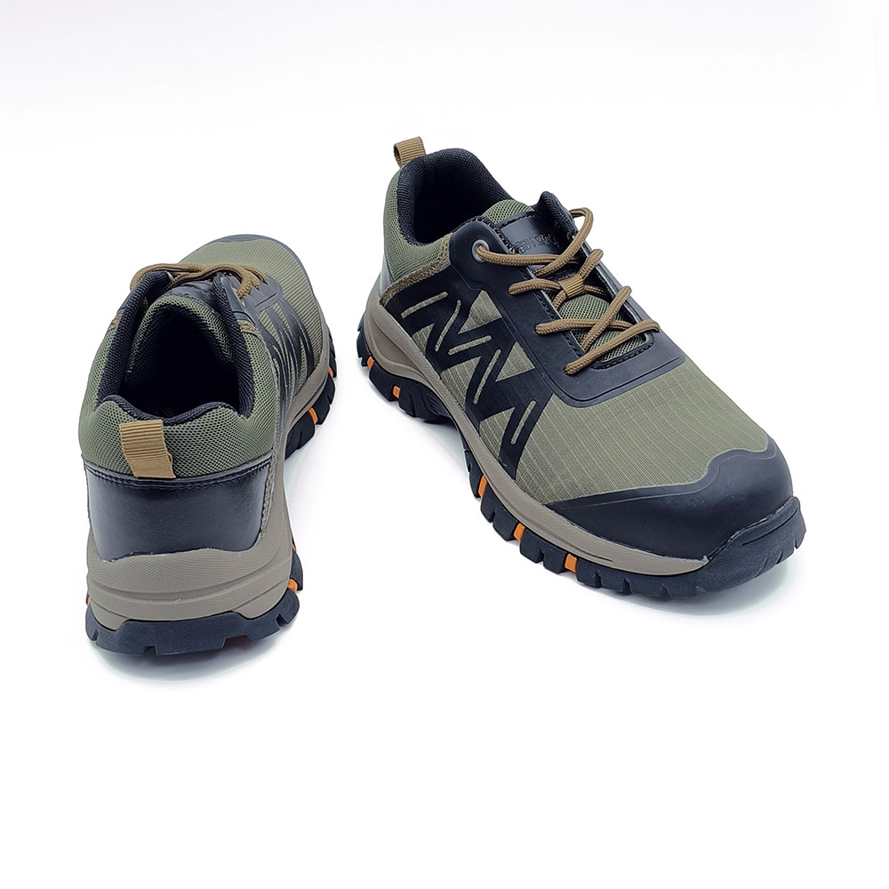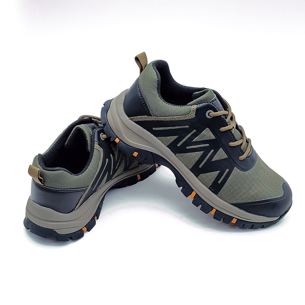 Its main features include an army green and black color design, leather and mesh upper, low-cut structure, and two-tone rubber outsole.